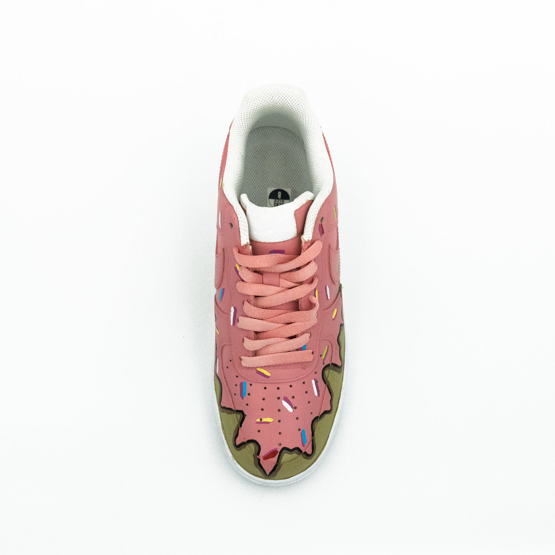 Good enough to eat, a classic pink frosted, sprinkled donut for your feet! Hand-painted Air Force 1 Lows by Stomping Ground Customs.