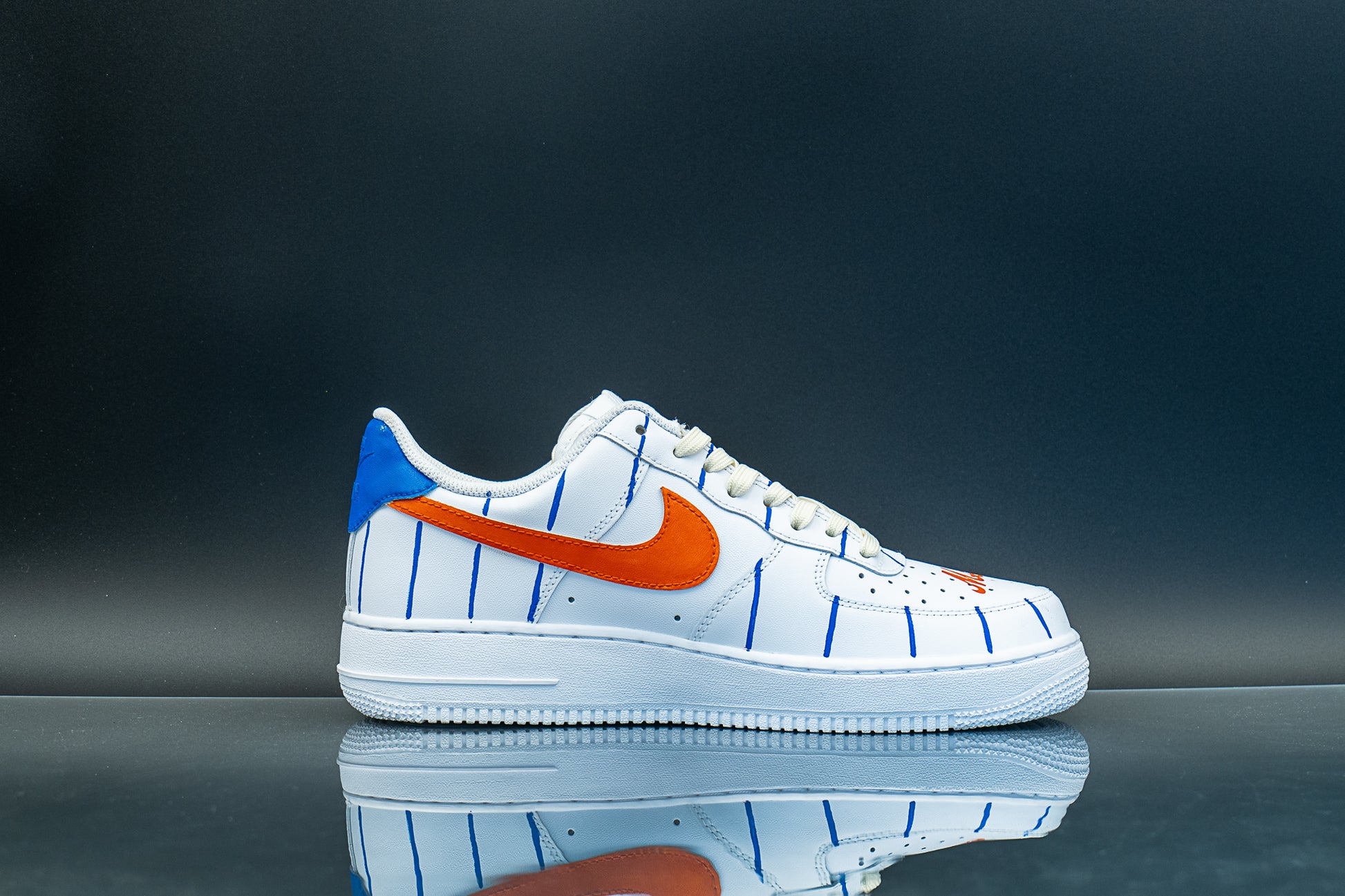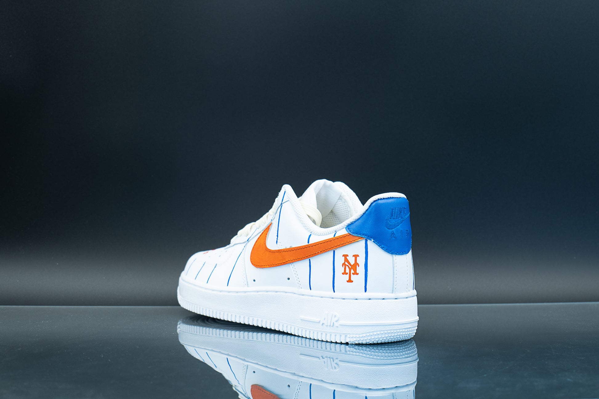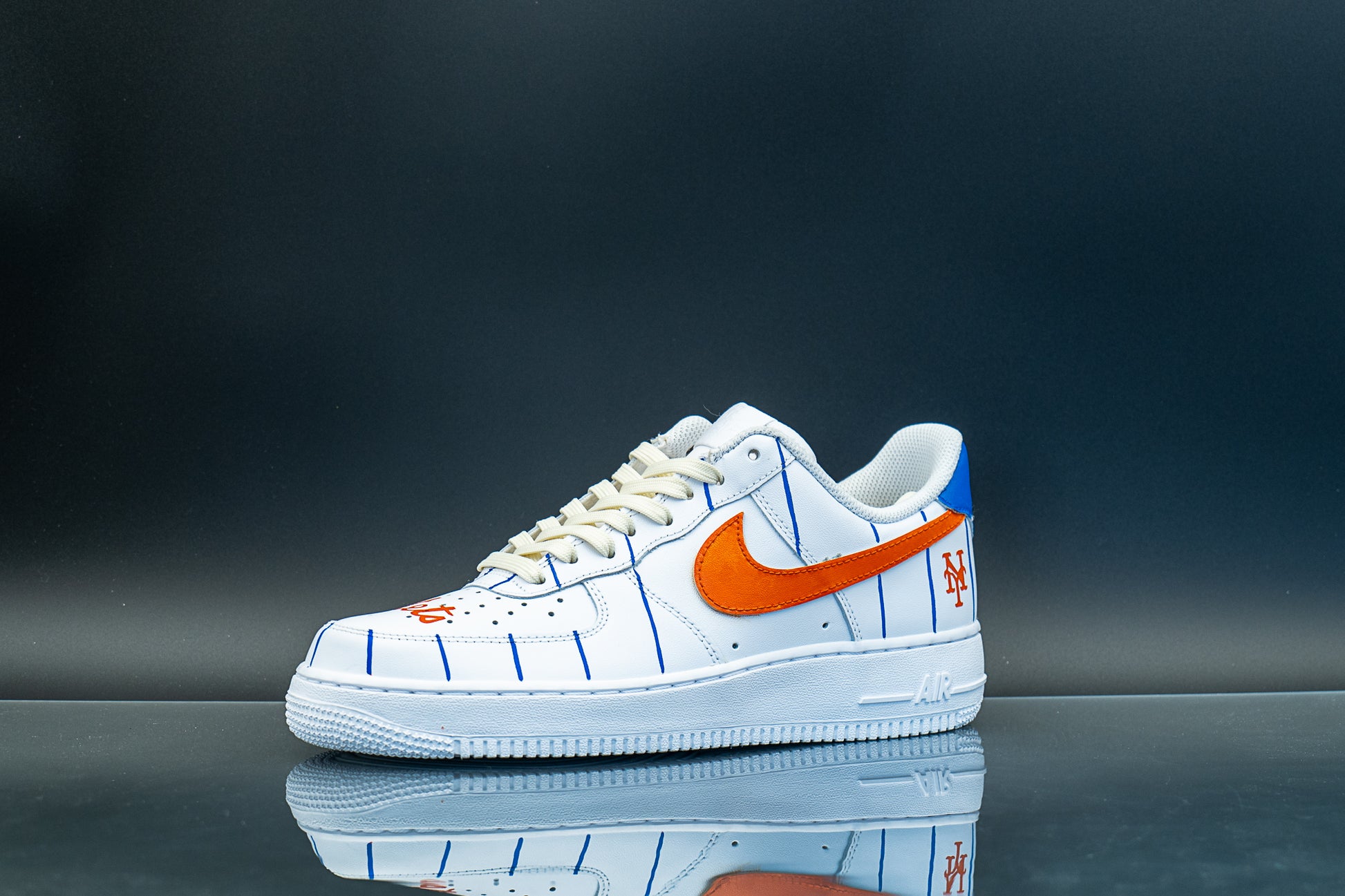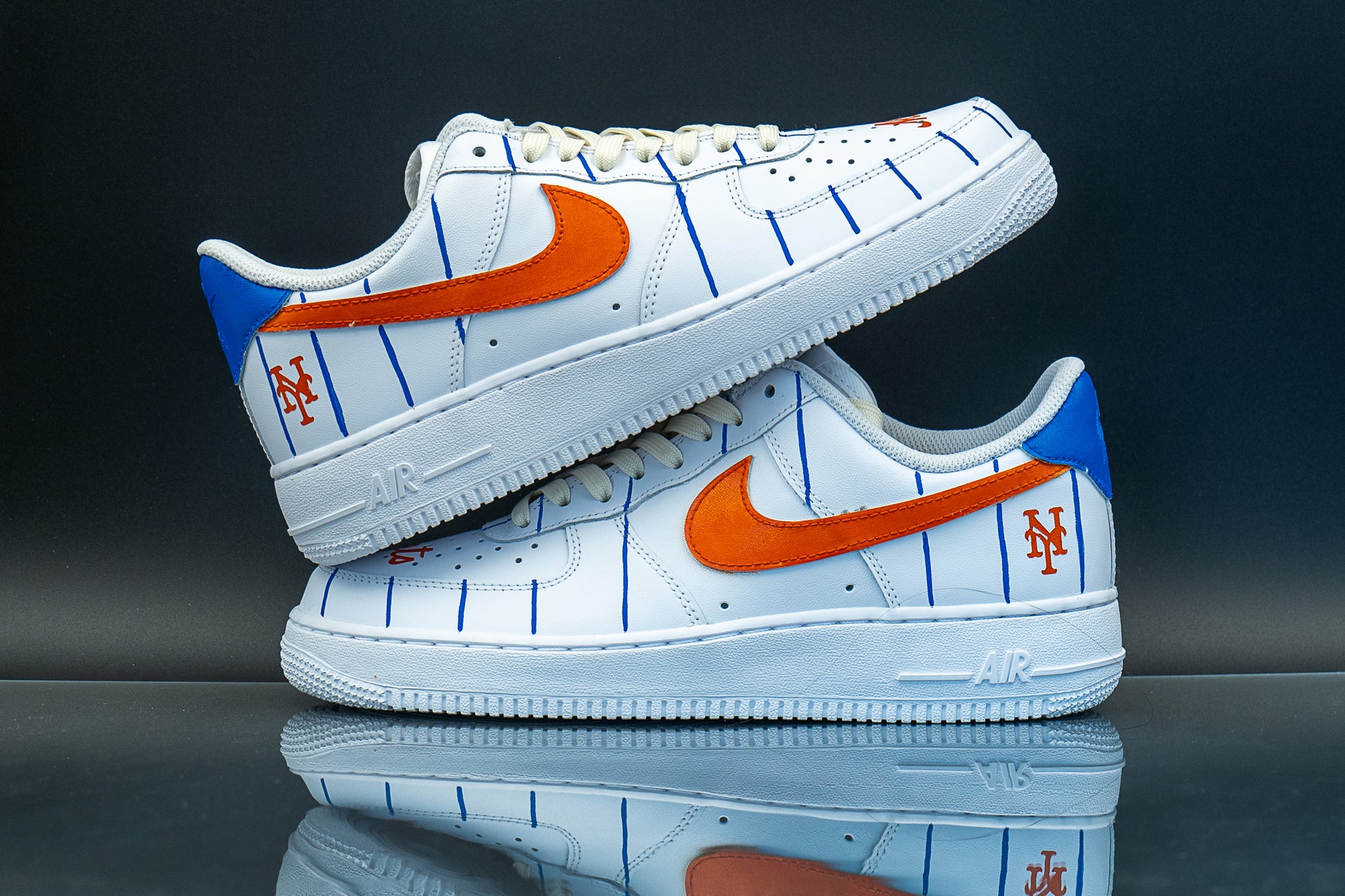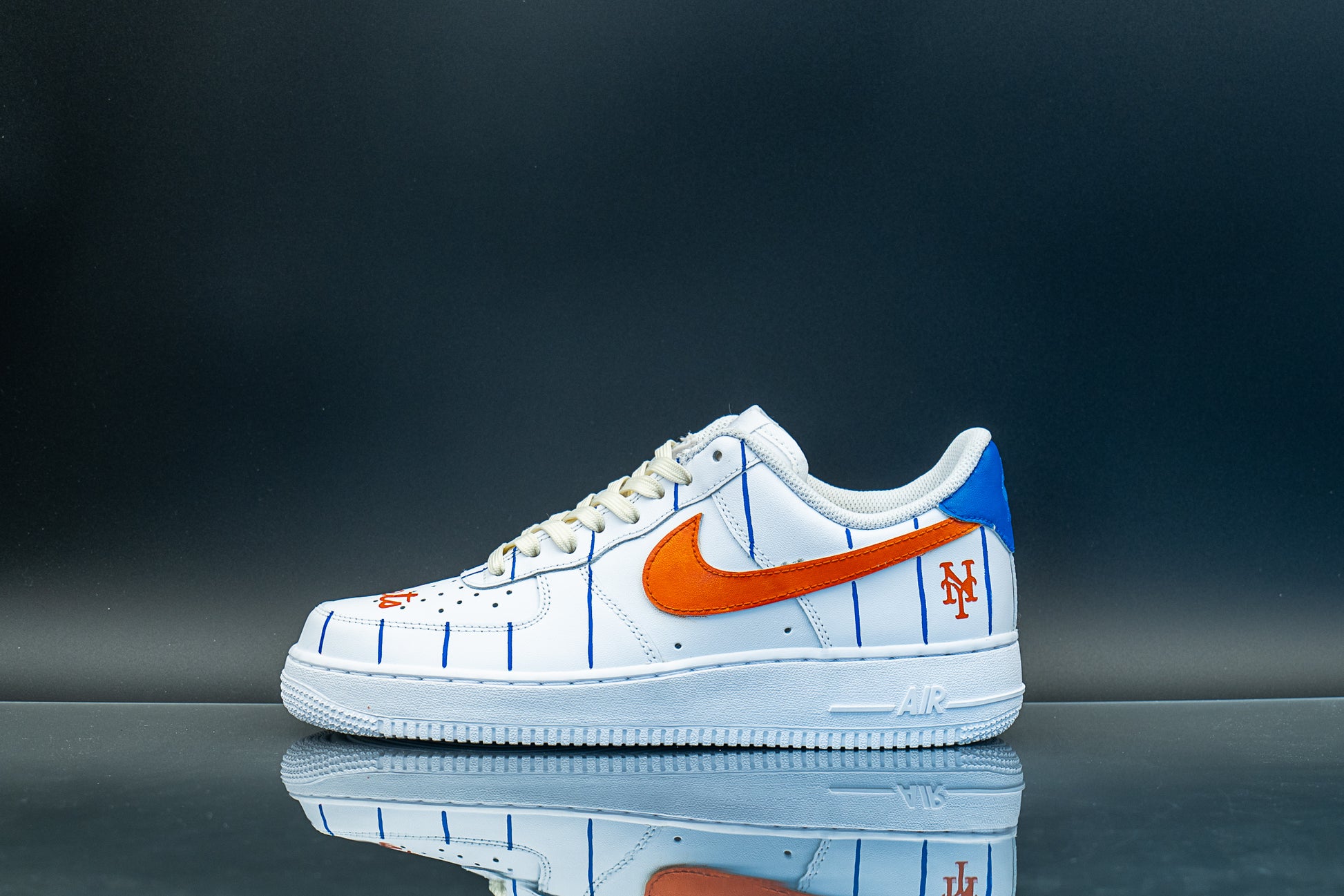 Show your team pride with our unofficial Mets AF1s! A pinstripe pattern all around and orange-painted checks to match the team colors, with logo on heel and name in the toe box.