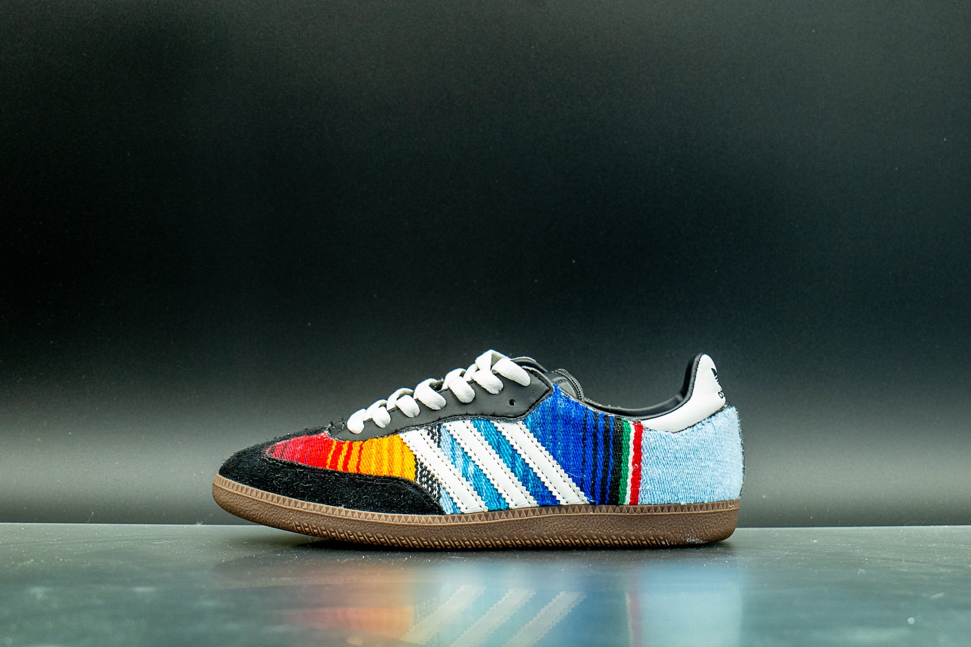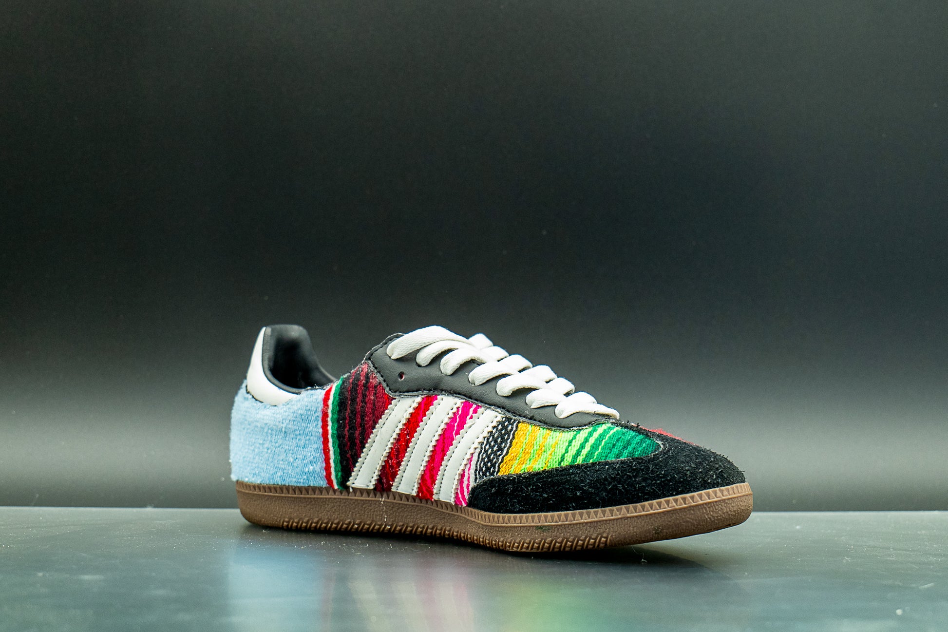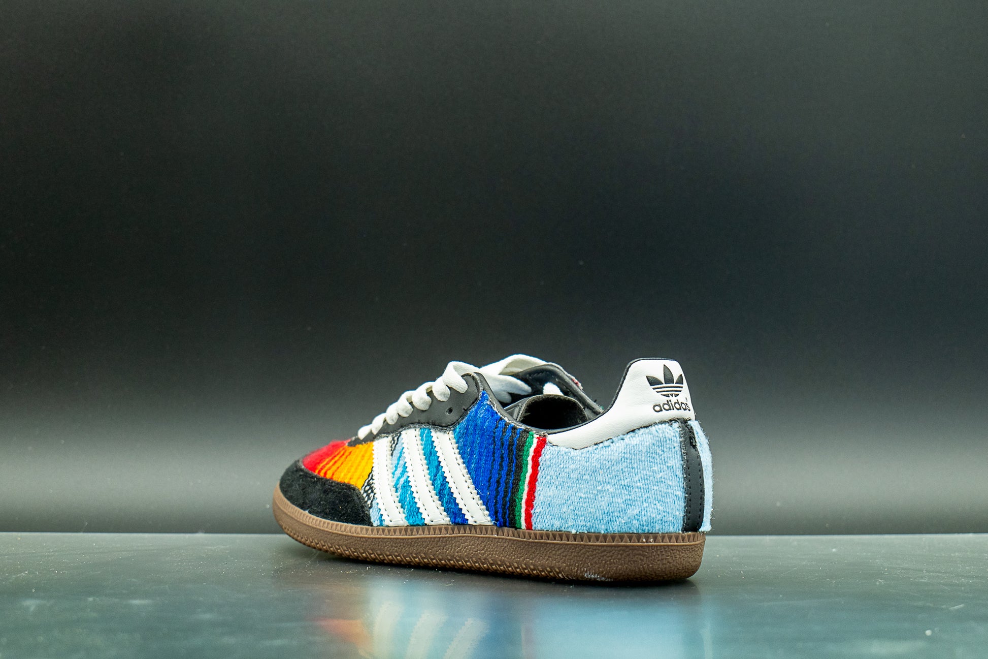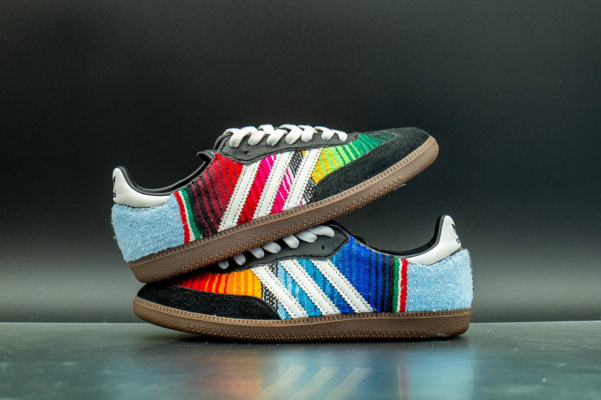 The classic fit of the Adidas Samba, with stitched panel inlays made from traditional Mexican serapes.