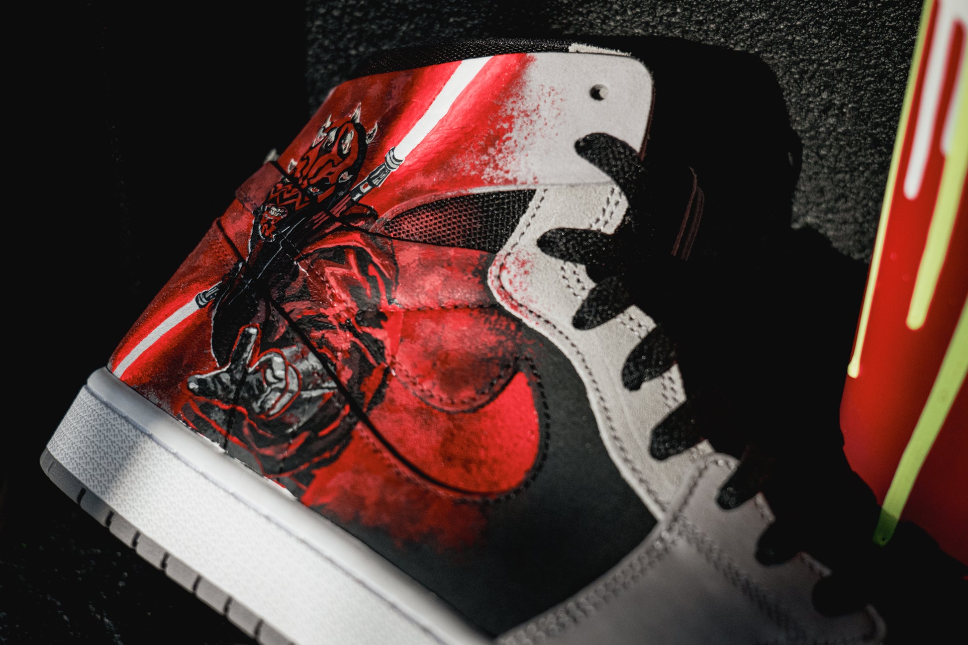 Each pair of "The Dark Side" Jordan 1 High from EMCEE Kicks is expertly painted, featuring iconic Star Wars characters - Darth Vader on one shoe and Darth Maul on the other. Crafted on a classic Jordan 1 High silhouette, these sneakers are the perfect blend of fashion and fandom.